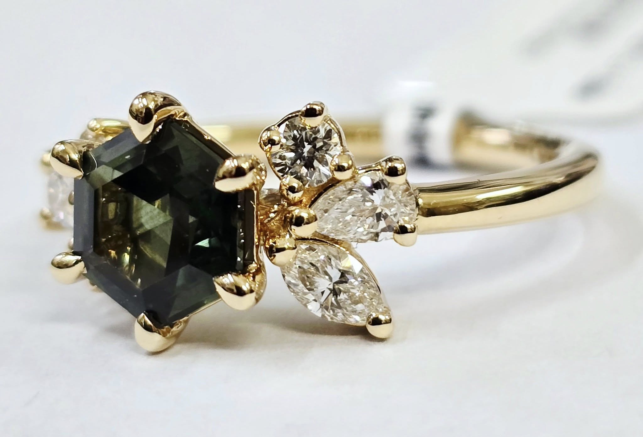 This striking ring showcases a rare hexagon-cut Australian sapphire, a gemstone celebrated for its deep, shifting shades of green. Perfectly balanced by a cluster of sparkling white diamonds, it’s a design that radiates both sophistication and individuality.